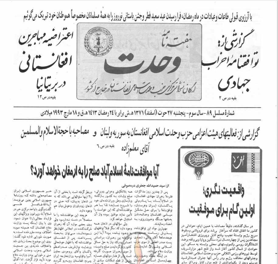 هفته‌نامه‌ی « وحدت»، سال سوم (1371) شماره‌ 89