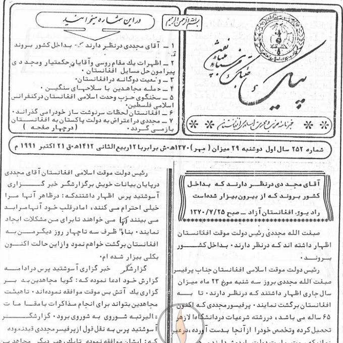 2- اظهارات یک مقام روسی و آقایان حکمتیار و مجددی پیرامون حل مسائل افغانستان