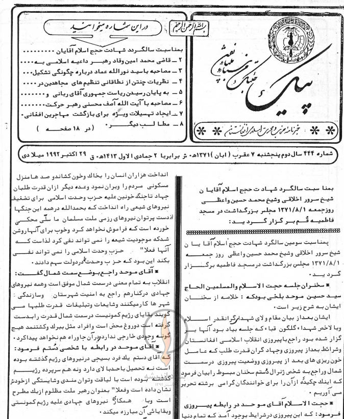 خبرنامه «پیک وحدت» سال سوم (1371) شماره 444