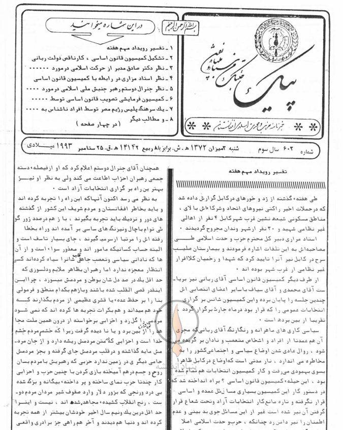 خبرنامه «پیک وحدت» حاوی رویدادها و تحولات سیاسی، فرهنگی و نظامی افغانستان است که در سال های 1369 تا 1373 از رسانه های بین المللی جهان پخش و نشر گردیده و توسط حزب وحدت اسلامی افغانستان جمع آوری شده و در اختیار عموم مردم قرار گرفته است. این تحولات و رویدادها بخشی از تاریخ سیاسی و نظامی افغانستان استش که توسط بنیاد اندیشه به صورت الکترونیکی آماده شده و در اختیار پژوهشگران و محققان گرامی قرار گرفته است.