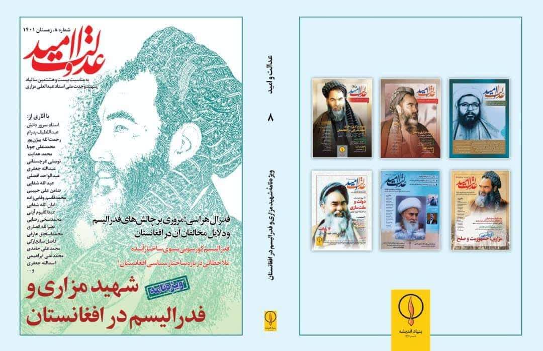 هشتمین (8) شماره فصلنامه عدالت و امید، ویژنامه ای است تحت عنوان: شهیدمزاری و فدرالیسم در افغانستان. آثار متعدد و مختلف علمی از نویسندگان و پژوهشگران صاحب قلم گردآوری شده است. آثاری در باره ماهیت و چیستی فدرالیسم، الزامات و عناصر آن، بررسی تجربه نظام فدرالیسم در دیگر کشورها، مزیت ها و تهدیدات نظام فدرالیسم در افغانستان، فدرالیسم در اندیشه شهید مزاری و ...در این ویژه نامه به صورت الکترونیکی به دست نشر سپرده شده است. اینک فهرست تفصیلی این آثار تقدیم خوانندگان می گردد:
