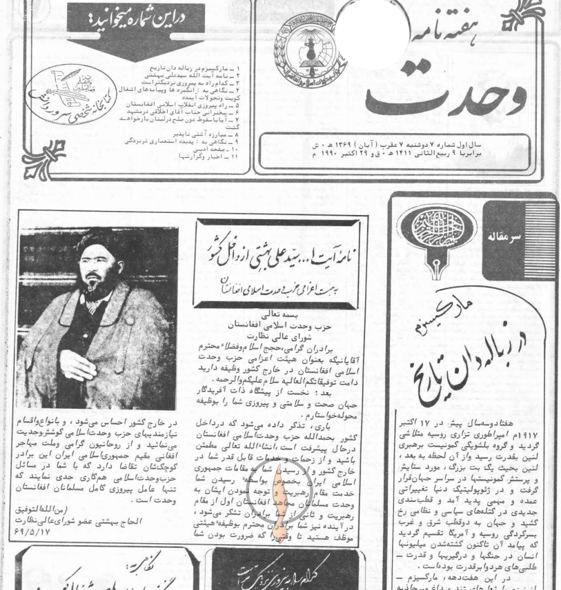 هفته نامه وحدت، جريده سياسي-خبري حزب وحدت اسلامي افغانستان كه در خارج از كشور و در جمهوري اسلامي ايران – شهر مقدس قم- زير نظر كميسيون فرهنگي حزب وحدت اسلامي افغانستان و با مدير مسئولي استاد دانش به نشر مي رسد.