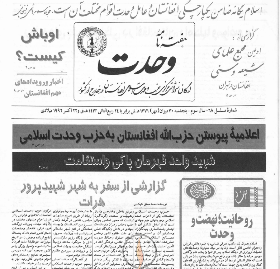 هفته نامه وحدت، جريده سياسي-خبري حزب وحدت اسلامي افغانستان كه در خارج از كشور و در جمهوري اسلامي ايران – شهر مقدس قم- زير نظر كميسيون فرهنگي حزب وحدت اسلامي افغانستان و با مدير مسئولي استاد دانش به نشر مي رسد.