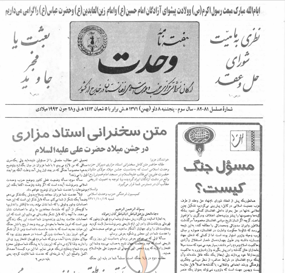 هفته نامه وحدت، جريده سياسي-خبري حزب وحدت اسلامي افغانستان كه در خارج از كشور و در جمهوري اسلامي ايران – شهر مقدس قم- زير نظر كميسيون فرهنگي حزب وحدت اسلامي افغانستان و با مدير مسئولي استاد دانش به نشر مي رسد.
