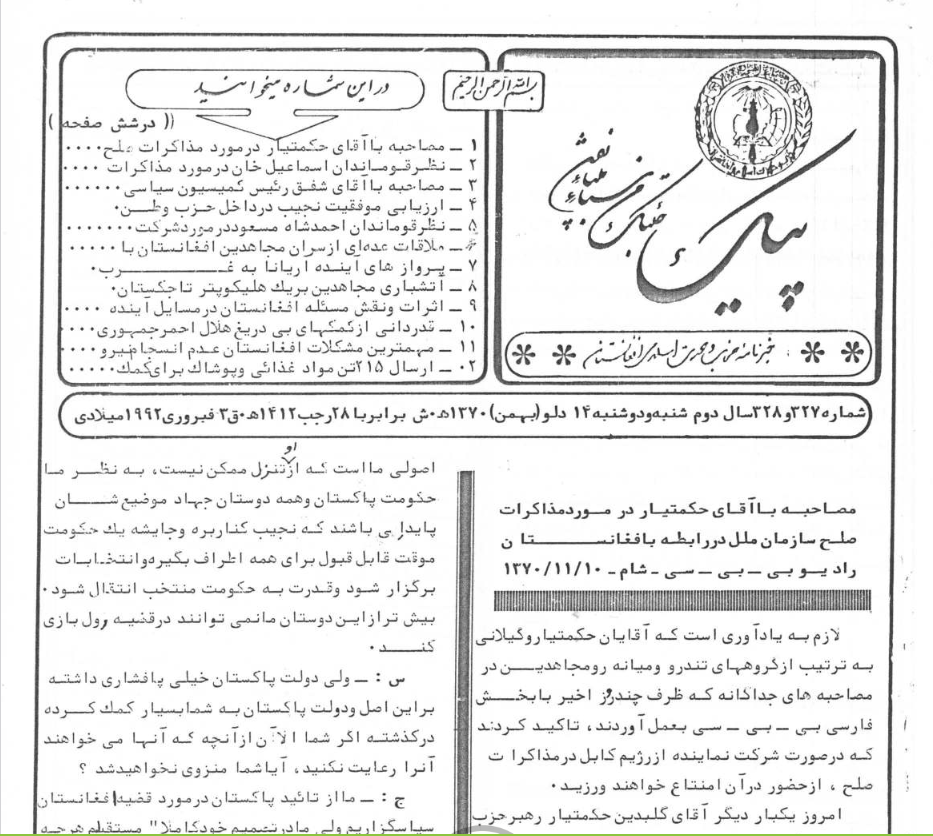 1- مصاحبه با آقای حکمتیار در مورد مذاکرات صلح