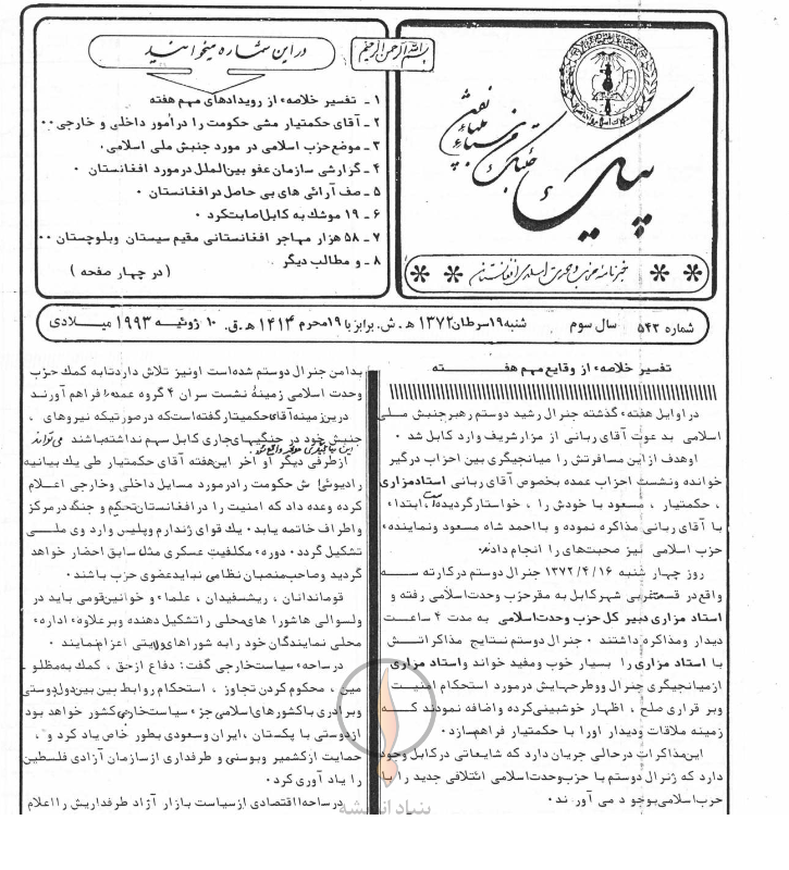 خبرنامه «پیک وحدت» حاوی رویدادها و تحولات سیاسی، فرهنگی و نظامی افغانستان است که در سال های 1369 تا 1373 از رسانه های بین المللی جهان پخش و نشر گردیده و توسط حزب وحدت اسلامی افغانستان جمع آوری شده و در اختیار عموم مردم قرار گرفته است. این تحولات و رویدادها بخشی از تاریخ سیاسی و نظامی افغانستان استش که توسط بنیاد اندیشه به صورت الکترونیکی آماده شده و در اختیار پژوهشگران و محققان گرامی قرار گرفته است.